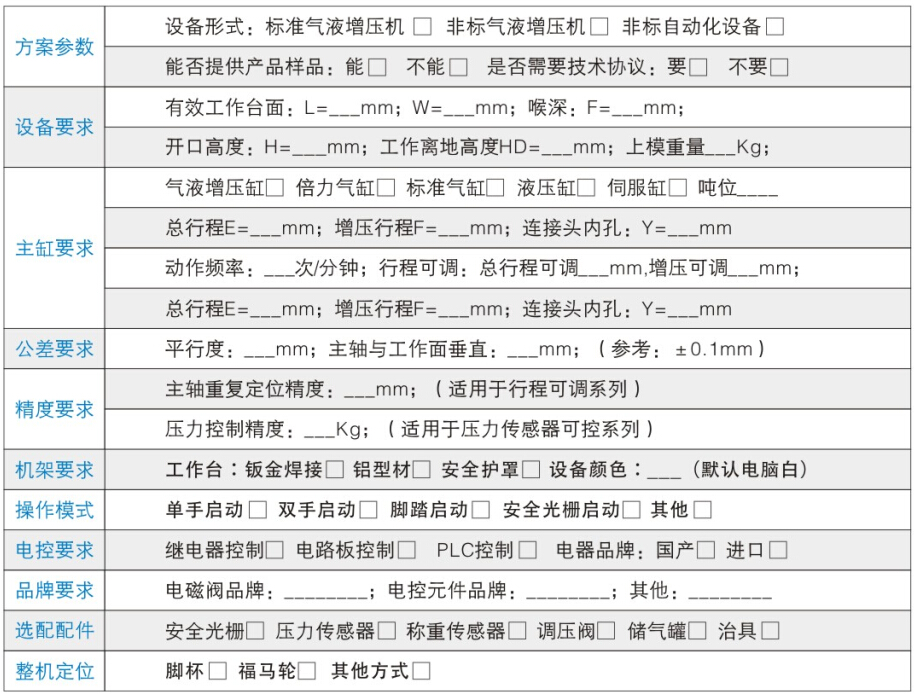 1. 采用气液增压缸作为出力执行元件;2. 电箱采用可编程电路板+电子显示屏对动作进行逻辑控制;3. 采用德国IFM压力传感器对实际出力进行检测判定;4. 采用日本CKD减压阀对增压压力进行精准调节;5. 具备防护罩,安全光幕,紧急停止按钮,双手启动等安全防护功能。